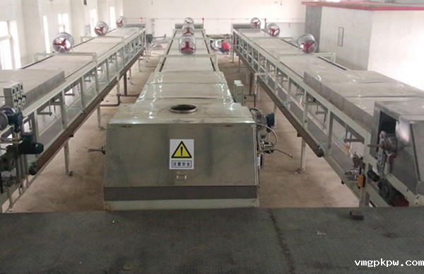 将来自上游工序热融态物料通过造粒机布料器(右图)均布在其下方匀速移动的钢带上,钢带下方设置有连续喷淋、冷却装置,迫使钢带上方的物料在移动过程得以快速冷却、固化,从而达到造粒成型的目的。依据物性和使用要求,其布料器可选择断续滴下、连续拉条和全宽度溢流等不同形式,以分别生产半球状、条状和片状产品。